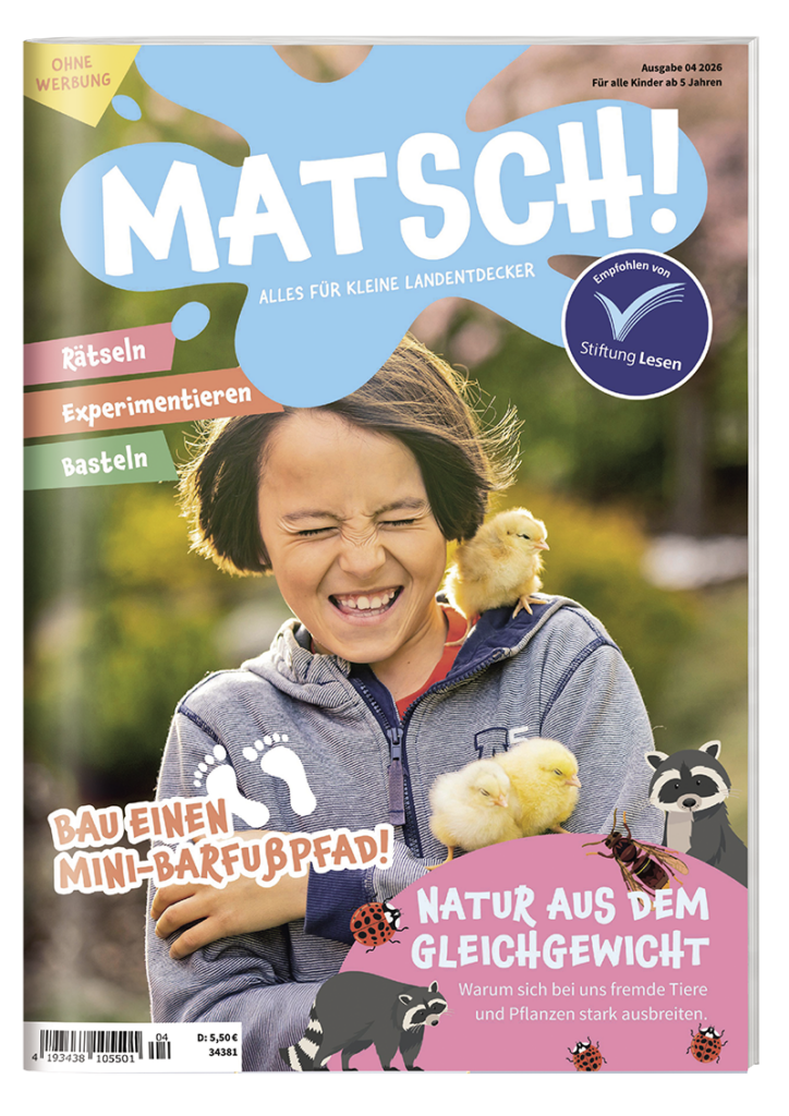 Wie entsteht aus einem Ei eigentlich ein Huhn? Wie wird aus Getreide Brot gemacht? Wie sind Moore entstanden? Diese und viele andere Fragen werden bei MATSCH! kindgerecht erklärt. Mit jeder Menge Aha-Momenten, kniffeligen Rätseln, leckeren Rezepten und coolen Bastelideen kommt unser MATSCH! Magazin für Kinder monatlich direkt in euren Briefkasten. MATSCH! ist mehr als nur eine normale Kinderzeitschrift - probiert es aus!